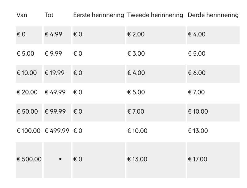 Als Klarna niet de volledige betaling heeft ontvangen op de vervaldatum die op de factuur wordt vermeld, moet je aanmaningskosten betalen in overeenstemming met onderstaande tabel. Tussen iedere herinnering zit minimaal 10 dagen.